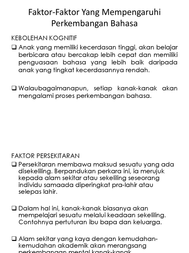 3 0 Faktor Yang Mempengaruhi Pemerolehan Bahasa from demo.pdfslide.tips Bahasa merupakan medium komunikasi asas samada dengan tulisan, lisan mahupun dengan panggunaan isyarat. Faktor genetik atau faktor baka ini memainkan peranan yang penting dalam mempengaruhi perkembangan fizikal seseorang individu. Perkembangan bahasa anak yang dimaksud yakni meningkatnya kemampuan penguasaan alat dalam perkembangan bahasa anak, menurut para ahli terdapat sejumlah faktor yang dapat mempengaruhinya. Perkembangan ini dipengaruhi oleh dua faktor yang menjadikan setiap menusia mempunyai perwatakan dan personaliti yang berbeza. Mempelajari instrumen muzik memerlukan sikap dedikasi dan kerja keras yang tinggi. Berikut faktor ekonomi yang mempengaruhi pembangunan ekonomi: Hal ini disebabkan adanya hubungan rapat antara umur dan kematangan terutama sekali alat suara dan akal. Perkembangan merupakan suatu proses semulajadi terhadap diri manusia.