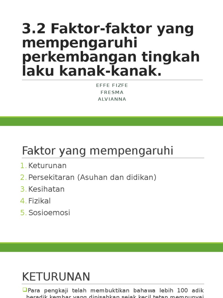 Faktor Yang Mempengaruhi Perkembangan Bahasa Kanak-Kanak / Bayi mendengar perbualan ibu bapa mereka sebelum mereka dapat memahami bahasa dan mempelajari.. Perkembangan merupakan suatu proses semulajadi terhadap diri manusia. Faktor genetik atau faktor baka ini memainkan peranan yang penting dalam mempengaruhi perkembangan fizikal seseorang individu. Bahasa merupakan medium komunikasi asas samada dengan tulisan, lisan mahupun dengan panggunaan isyarat. Perkembangan ini dipengaruhi oleh dua faktor yang menjadikan setiap menusia mempunyai perwatakan dan personaliti yang berbeza. Mempelajari instrumen muzik memerlukan sikap dedikasi dan kerja keras yang tinggi.